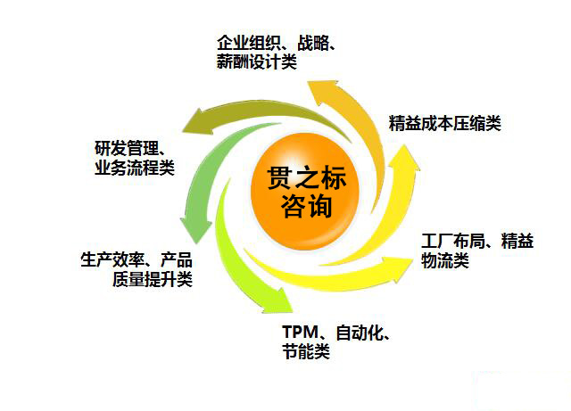 贯之标咨询创建了模块化咨询服务模式,不仅可以保证从现场诊断、精益或六西格玛方法论导入、精益或六西格玛人才培养,还可以在企业管理的方方面面,如企业组织、战略、薪酬蛇类,精益成本压缩类,工厂布局、精益物流类、TPM/自动化、节能改造类、生产效率、产品质量提升类、研发管理、业务流程类等都进行非常深入的专业咨询服务,为我们的客户提供全套的解决方案。